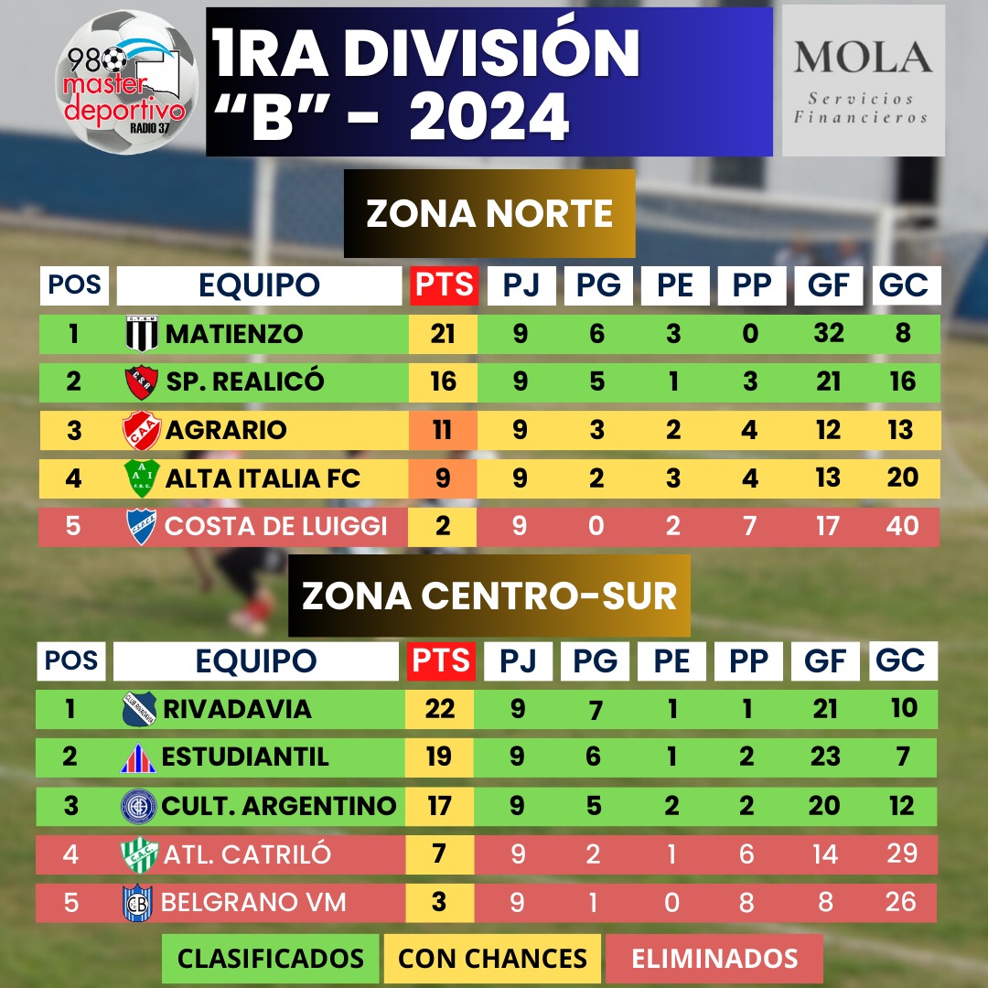 Matienzo es el único líder de la zona norte, que ya tiene a dos equipos clasificados y el último lugar se lo disputan entre Agrario y Alta Italia. En la zona centro sur está todo definido, con Rivadavia en el primer puesto por la derrota de Estudiantil frente a At. Catriló.