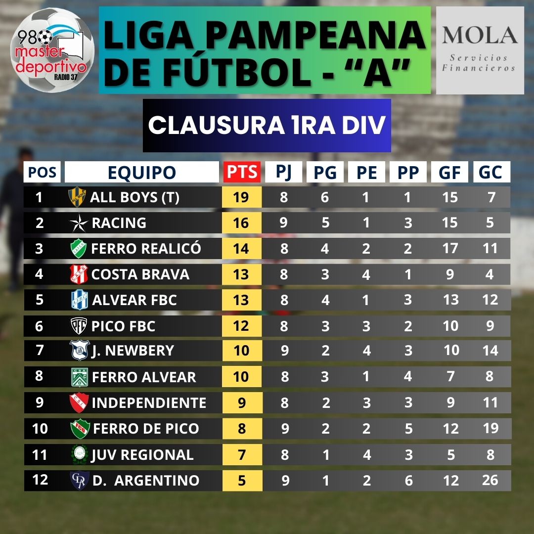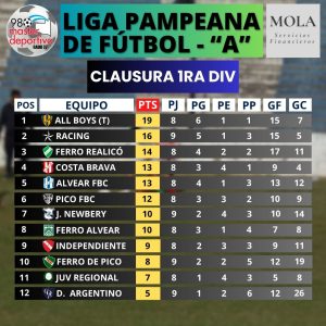 Además, en este sábado de adelantos, Racing de Castex superó 5-0 al Deportivo Argentino con un doblete de Julián Sosa, en el primer tiempo, más los tantos de Isaías Similán, Nicolás Sauro (e/c) y Nahuel Luna, en el complemento. El «Albo» quedó a 3 puntos de All Boys de Trenel, que mañana expone su liderazgo ante Ferro de Alvear en el «11 de julio».