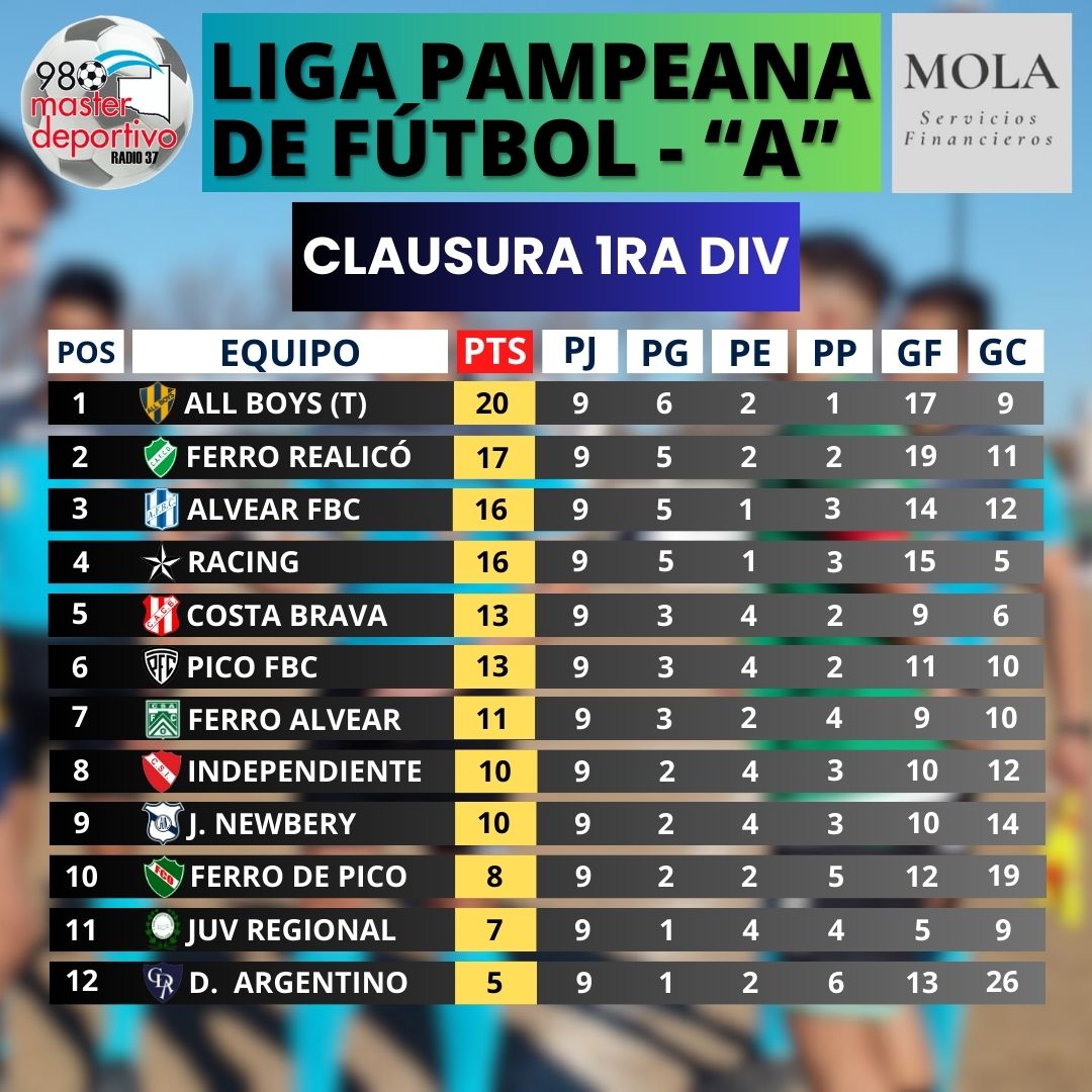 Se disputó la novena fecha del Torneo Clausura de la Liga Pampeana, en la que al líder, All Boys de Trenel (que empató 2-2 ante Ferro de Alvear), le descontaron la distancia 3 de los 4 perseguidores que tenía al comienzo de la jornada. Ferro de Realicó, el principal escolta, le ganó 2-o y dejó sin chances de pelear por el Clausura a Costa Brava, Alvear ganó 1-0 en Miguel Cané y Racing superó 5-0 al Deportivo Argentino.