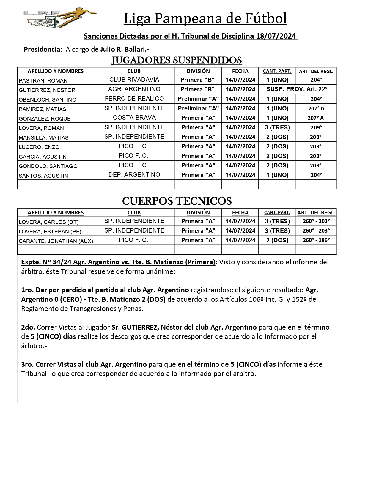 Este mediodía, el Tribunal de Disciplina de la Liga Pampeana le confirmó el triunfo a Matienzo sobre Agrario de Parera por 2-0. La situación que había desatado todo esto fue la agresión de Néstor Gutiérrez (AA) al árbitro Martín Gubar cuando iban 42’PT, cuando el «Tripero» ganaba 2-1. La decisión le quitó un gol al «Rojo» de Parera, le da 5 días al jugar para hacer el descargo y Luis Ovín, el presidente de la Liga Pampeana, confirmó que los 3 partidos de la Fecha 10 del Hexagonal de la «B» irá el domingo a las 15hs.