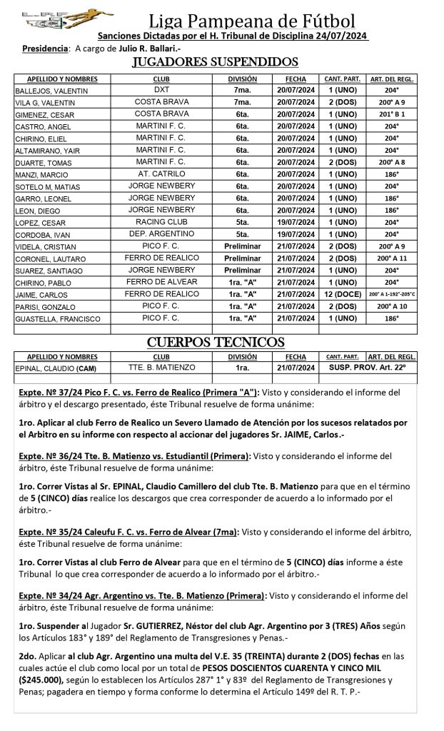 - Carlos «Chino» Jaime recibió 12 partidos de suspensión por los hechos sucedidos luego de su expulsión, en zona de vestuarios con una persona relacionada con Pico FBC. La sanción no le imposibilita jugar el Provincial.