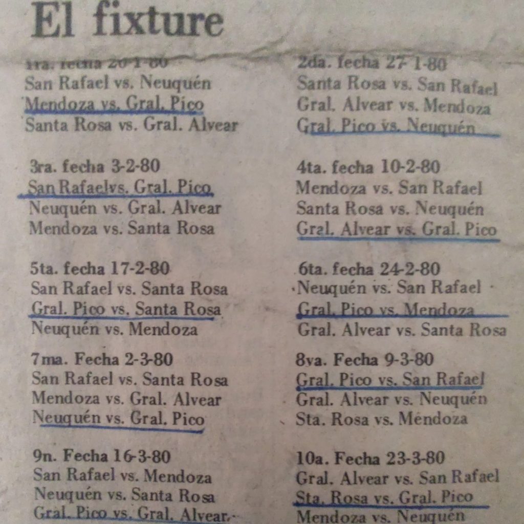 Amistoso de enero de 1980, antes del Regional: R. González, G. Moreno, D. Delgado, R. Retegui, M. Moreno, E. Acosta, C. Negrotto, C. Brizzio, Paolucci, M. Díaz, J. Schulmeister. DT. Juan Carlos Martín.